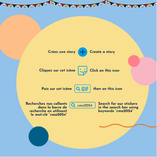 Trouvez-les sur Facebook, Instagram et Snapchat en tapant « cma2024 » ou autres mots-clés descriptifs dans la barre de recherche lorsque vous ajoutez un sticker à votre story.