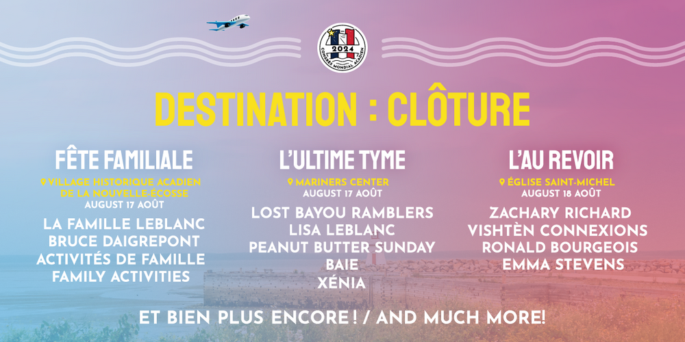 De la lignée de villages de la côte Nord acadienne ( le Par-en-Haut ) aux ports qui parsèment les pointes Sud-Ouest de la province ( le Par-en-Bas ), le Congrès mondial acadien 2024 ( CMA 2024 ) invite les participants à un voyage passionnant et inoubliable célébrant la culture, l’identité et le patrimoine acadien.Lire la suite